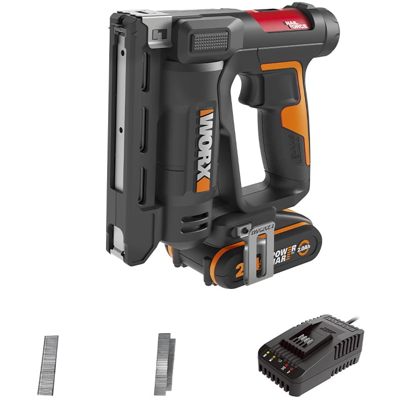 Степлер WORX WX843 20V — станет незаменимым помощником, когда нужно быстро скрепить материал скобами или каркасными гвоздями! Степлер мгновенно развивает скорость до 85 гвоздей/мин, что позволяет выполнять работу оперативно. Вы можете контролировать глубину и точность забивания, благодаря встроенной функции регулировки. На одном заряде АКБ на 2 Ач степлер производит до 2000 выстрелов.