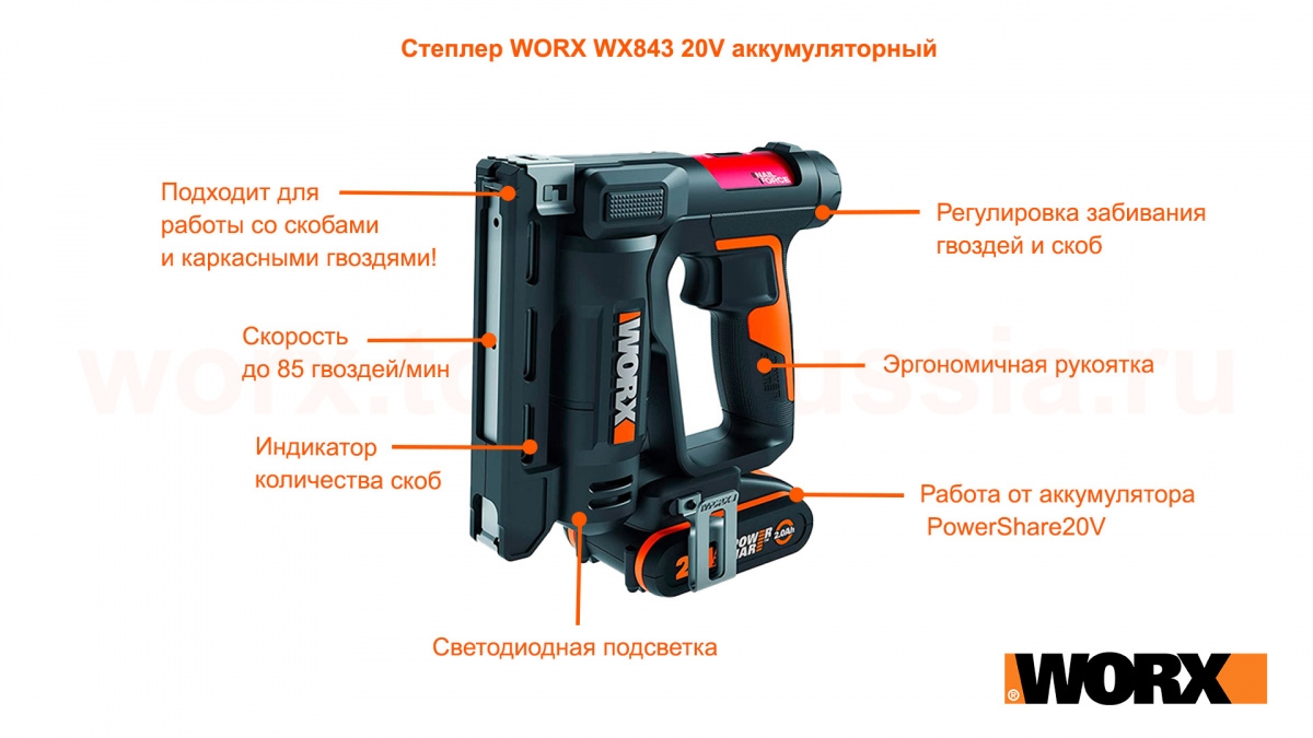 Степлер WORX WX843 20V аккумуляторный — идеален для быстрого скрепления каркасными гвоздями и скобами !