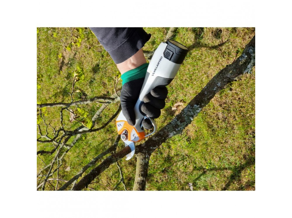 Секатор PA 1462 – легкий и компактный инструмент для аккуратного и легкого срезания веток деревьев и кустарника. Работает на аккумуляторе, вместе с батареей весит чуть более 1 кг. Комплектация изделия предусматривает две аккумуляторные батареи и одно зарядное устройство. Поставляется в пластиковом кейсе для удобного хранения. Инструмент имеет вытянутую форму по одной оси. Для режущих кромок лезвий предусмотрена оригинальная заточка, благодаря которой они долго остаются острыми. Режущий механизм устроен таким образом, чтобы живые ветки обрезались максимально ровно и бережно. Модель РА 1462 удобна в работе. Имеет прорезиненную рукоятку с двух сторон, за счет чего не скользит в руке. Есть предохранитель, благодаря которому исключается риск непреднамеренного включения секатора. У секатора предусмотрено два режима работы: в положении для резки веток диаметром до 32 мм и в режиме до 25 мм, чтобы подбираться лезвиями в труднодоступные места. Имеется система защиты от несчастного случая, чтобы оператор или ребенок не подсунул пальцы между лезвий. Система определяет пальцы человека и не закрывает ножи при контакте с ними.