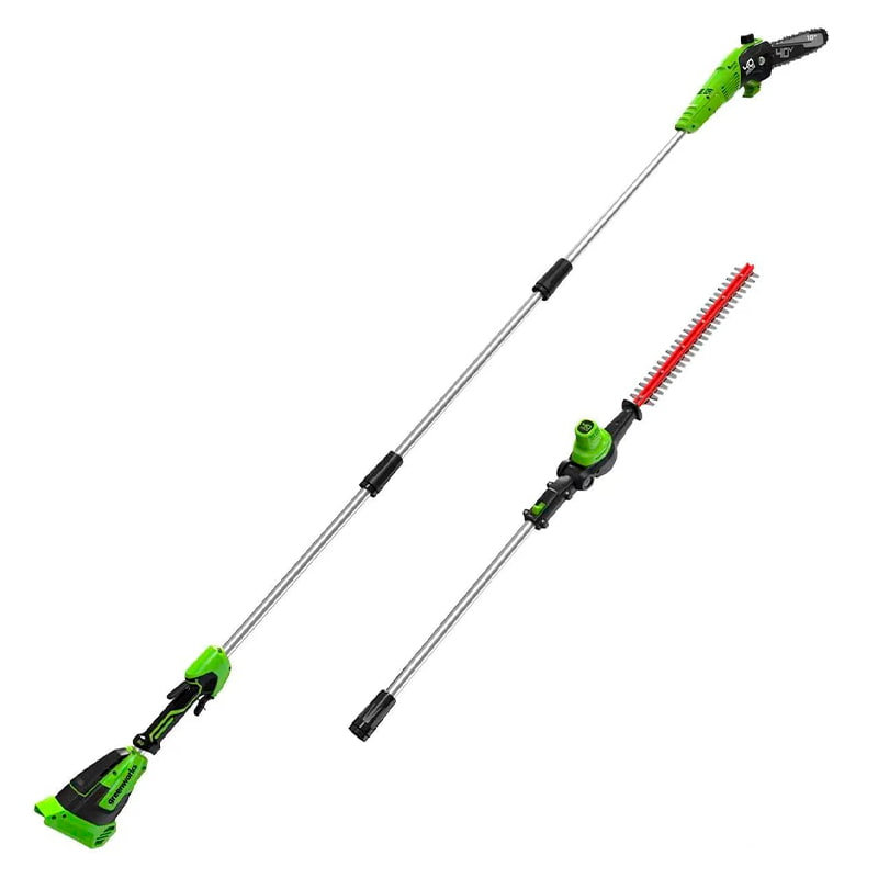 Высоторез-Кусторез аккумуляторный Greenworks Арт. 1303907, 2 в 1, 40V, без АКБ и ЗУ. — отличный инструмент для ухода за вашим садом. Имеет две сменные насадки, которые крепятся к штанге устройства.