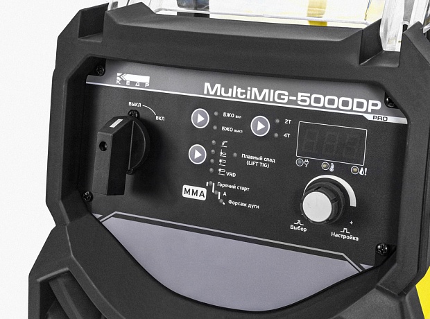 Сварочный инвертор КЕДР MultiMIG-5000DP- высокотехнологичный многофункциональный промышленный источник питания для MIG/MAG, MMA и TIG сварки. Аппарат имеет широкий пакет предустановленных программ, разработанных для различного типа проволоки, защитного газа и свариваемого металла, а также импульсные режимы сварки с использованием одинарного или двойного импульсов. Простое и интуитивно понятное управление, надёжность, высочайшая производительность и функционал позволяют рекомендовать данное оборудование для технологичных предприятий, работающих с изделиями из высоколегированной стали, алюминия, кремнистой бронзы и других материалов в промышленном цикле.