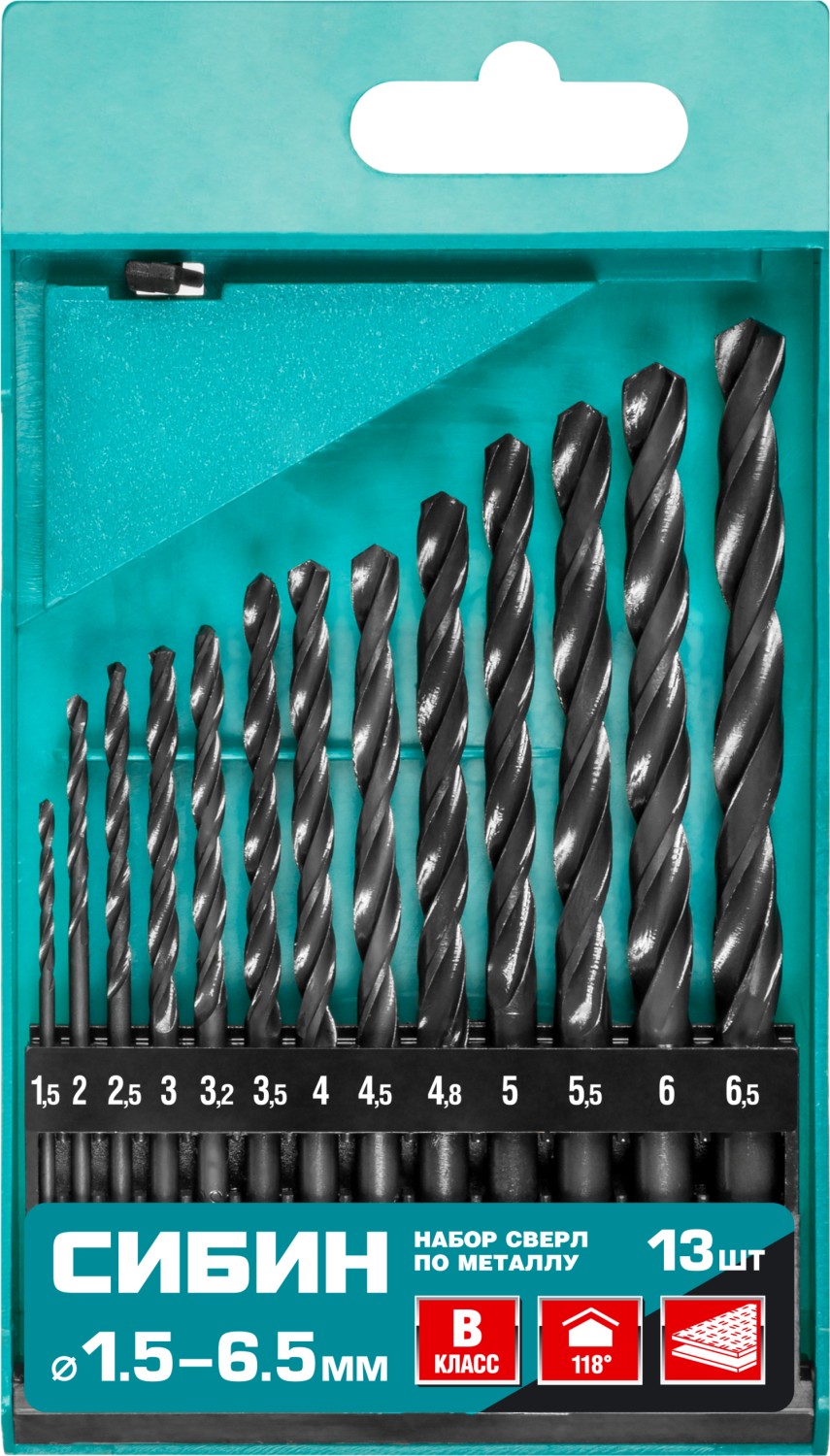 Набор спиральных сверл по металлу СИБИН 13 шт, (1.5-6.5 мм), быстрорежущая сталь, класс В