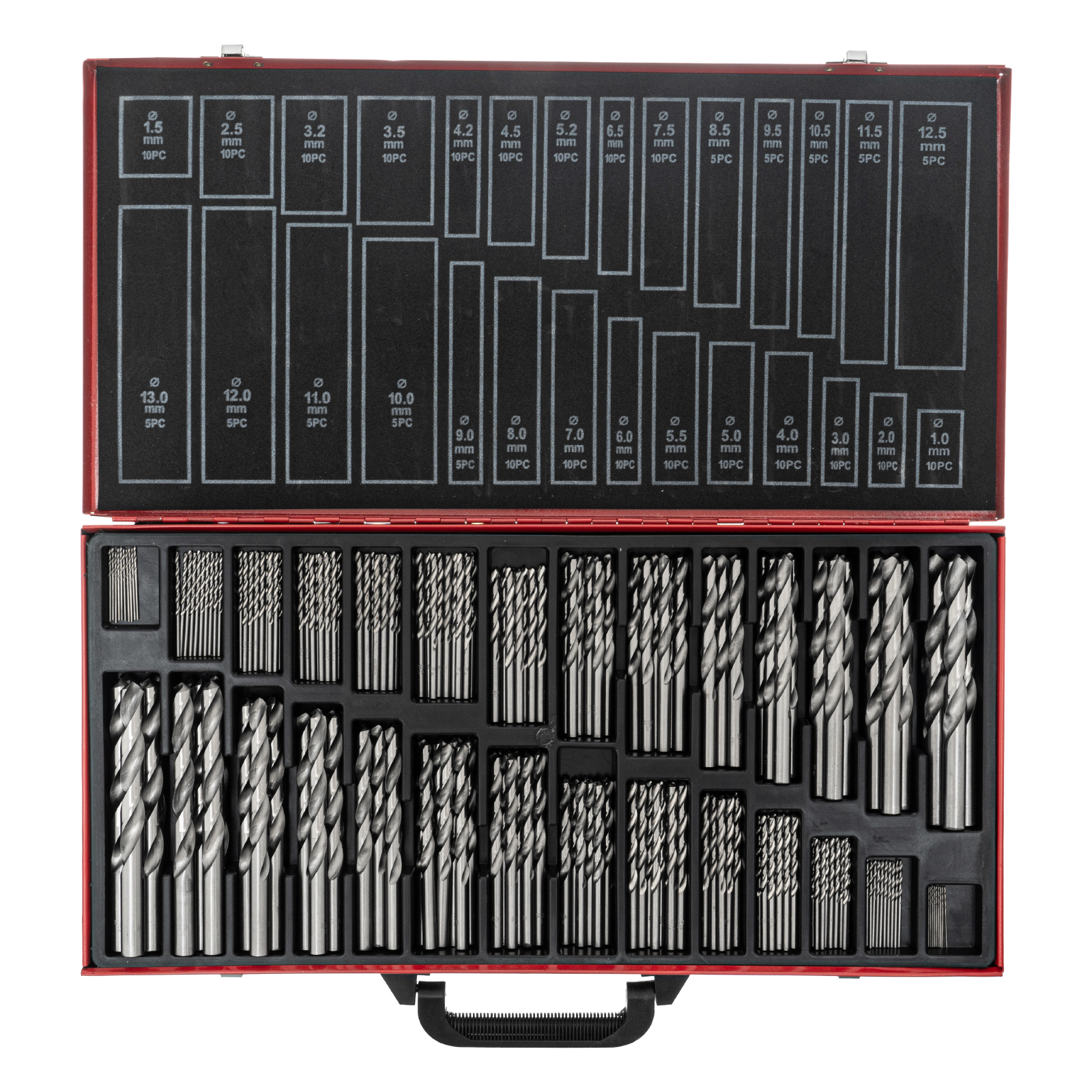 Набор Matrix 723230 включает в себя 230 сверл по металлу из стали HSS, диаметром 1-13 мм, упакованных в металлический кейс. Угол заточки сверл составляет 118°, поэтому они оптимальны для обработки черных металлов, стали, чугуна и твердой бронзы. Набор пригодится в быту и на строительной площадке.