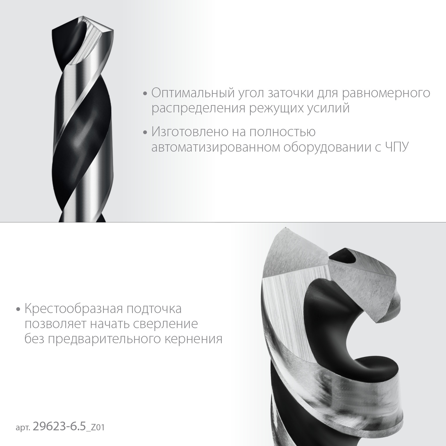 - Шестигранный хвостовик с проточкой исключает возможность проворачивание сверла в патроне и облегчает замену инструмента