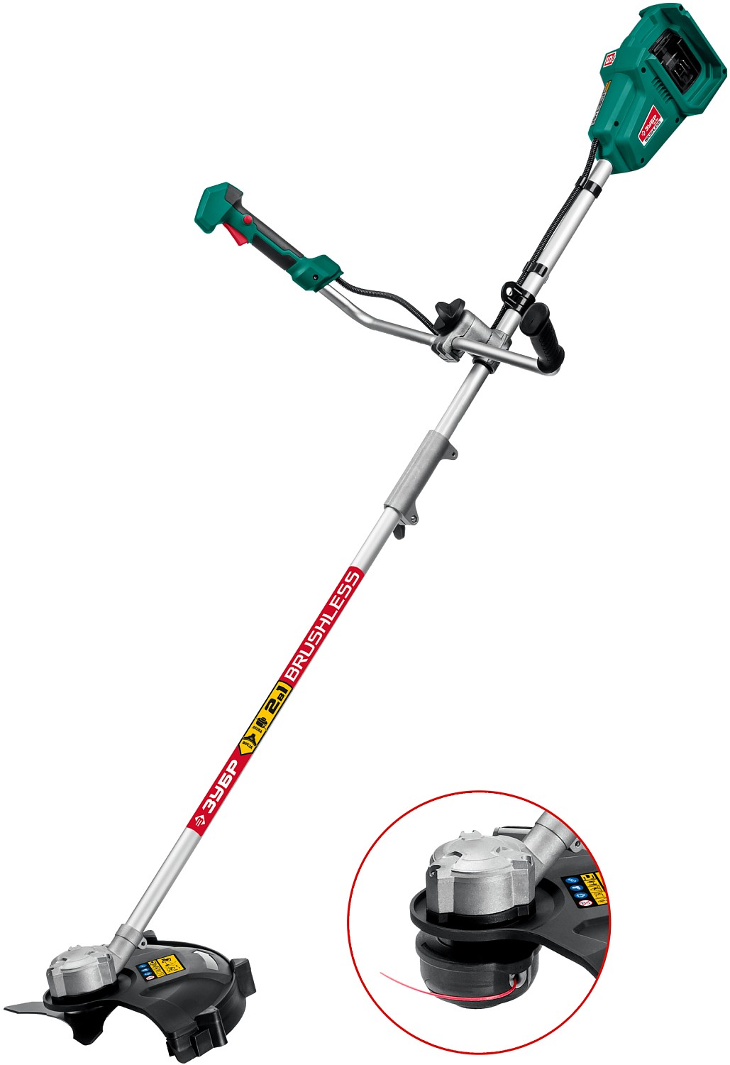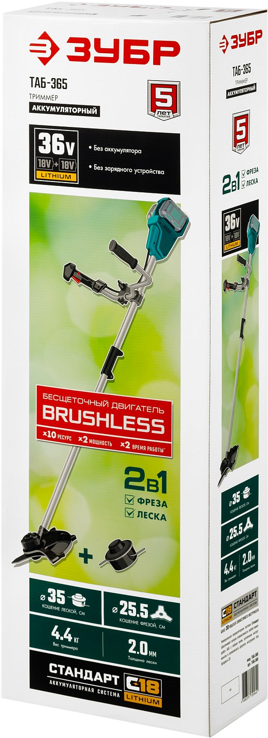 Универсальный инструмент на участке, способный заменить газонокосилку и триммер. Оснащается катушкой с леской (для мягкой растительности) и ножом (для грубой растительности). Большая мощность двигателя BRUSHLESS и две батареи позволяют косить довольно густую и грубую растительность длительное время