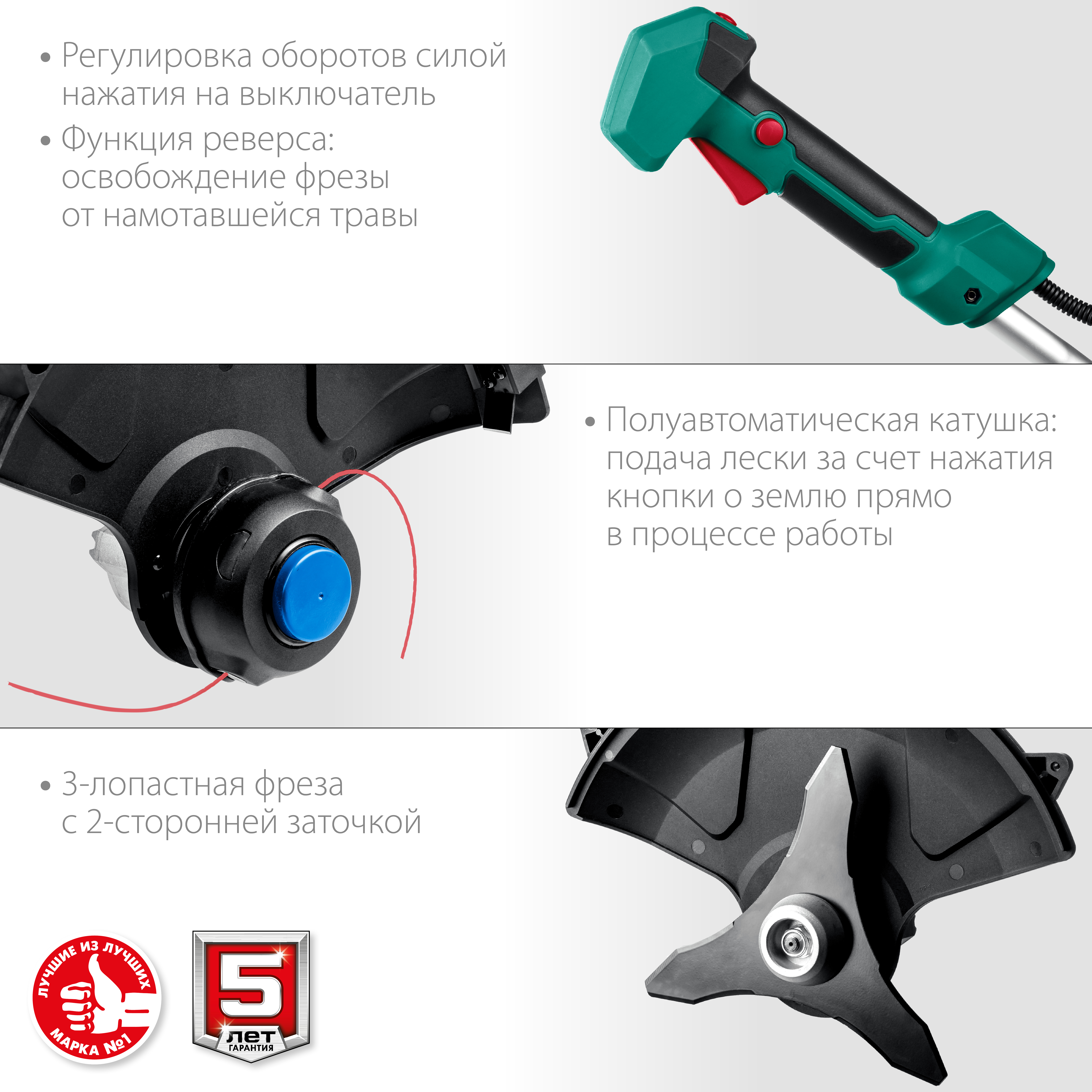 - Возможность установки двух видов режущего инструмента - лески и ножа - делают изделие универсальным