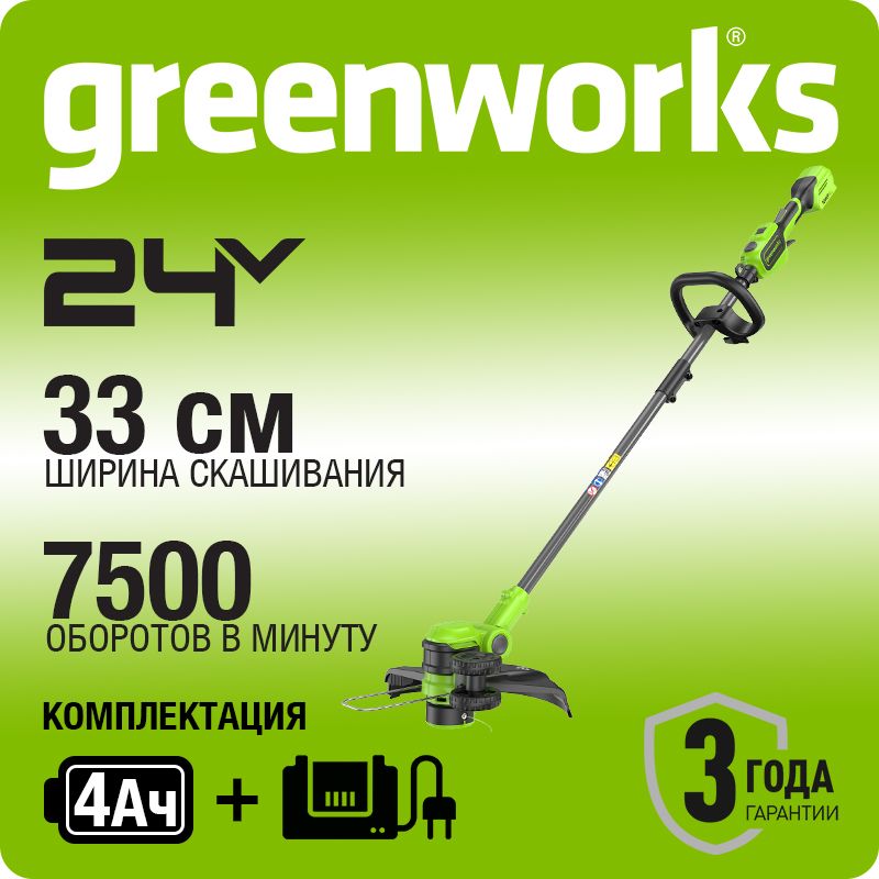 Триммер аккумуляторный Greenworks GD24LT331, 24V, 33 см, с 1хАКБ 4Ач и ЗУ (2113407UB) Легкий и достаточно мощный - отличная замена электрическому инструменту, его главное преимущество – автономность.