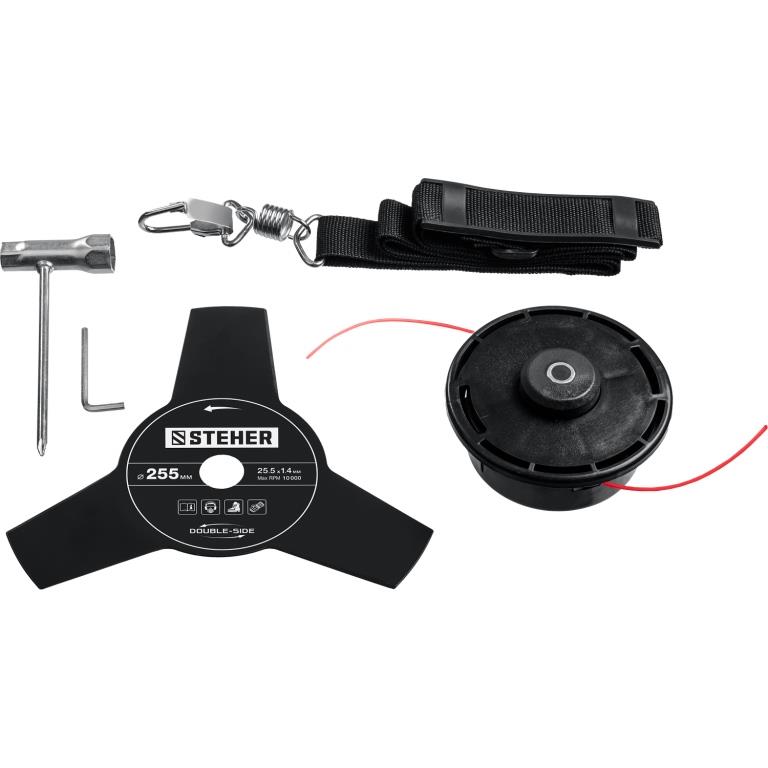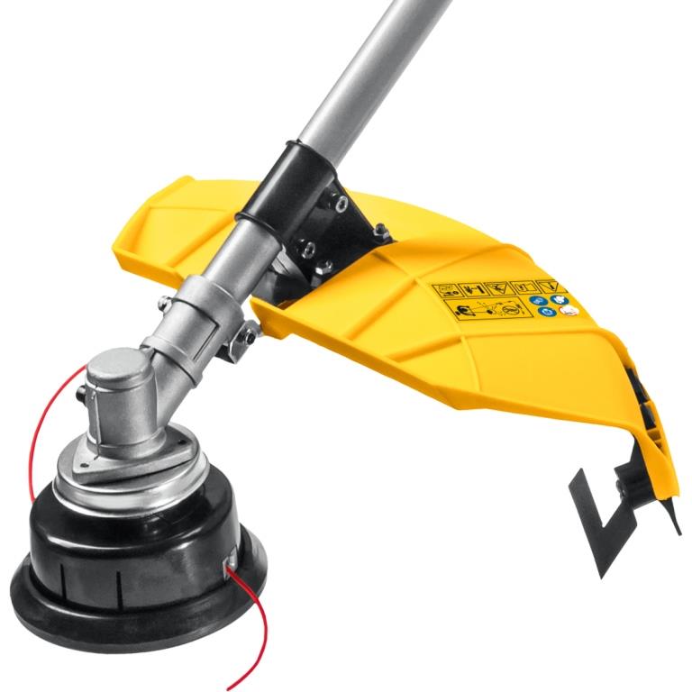 Универсальный инструмент на участке. Способна заменить газонокосилку и триммер, так как оснащается катушкой с леской (для мягкой растительности) и ножом (для грубой растительности). Большая мощность двигателя позволяет косить довольно густую и грубую растительность, а небольшие размеры - добраться до самых труднодоступных мест