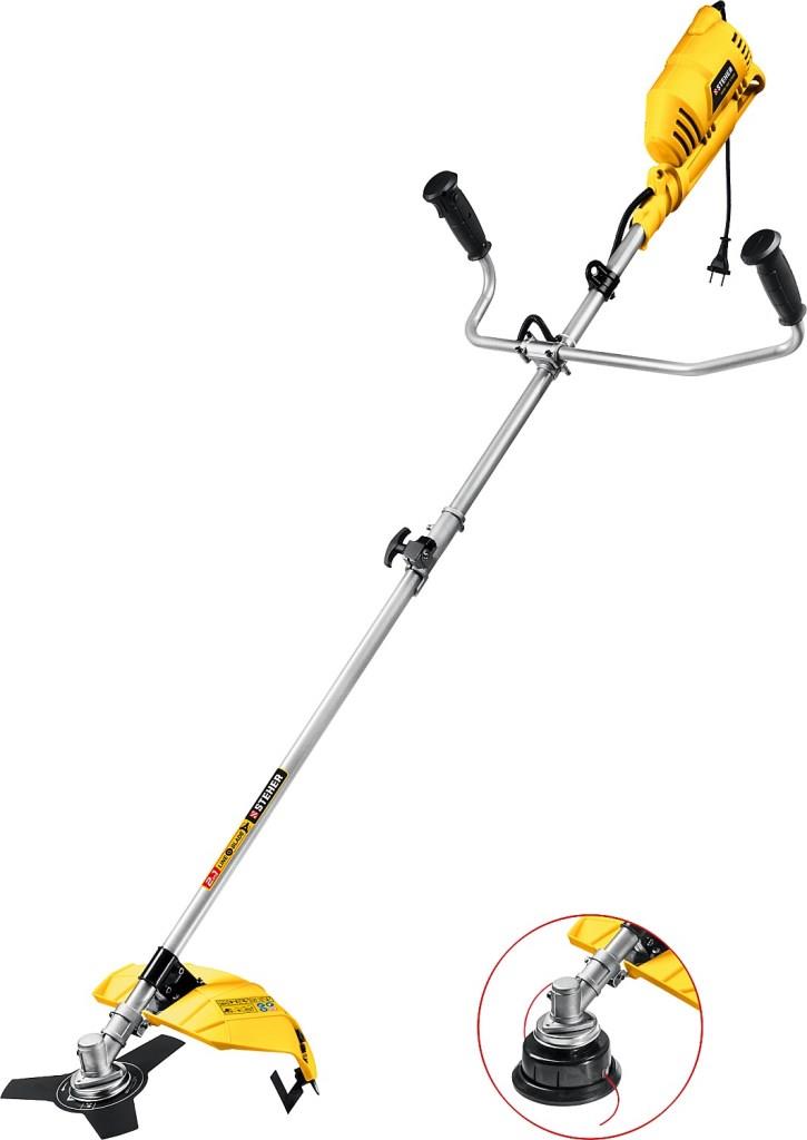 - Особенно мощный двигатель, леска диметром 2 мм или режущий нож позволят косить даже самую грубую растительность, вплоть до кустов