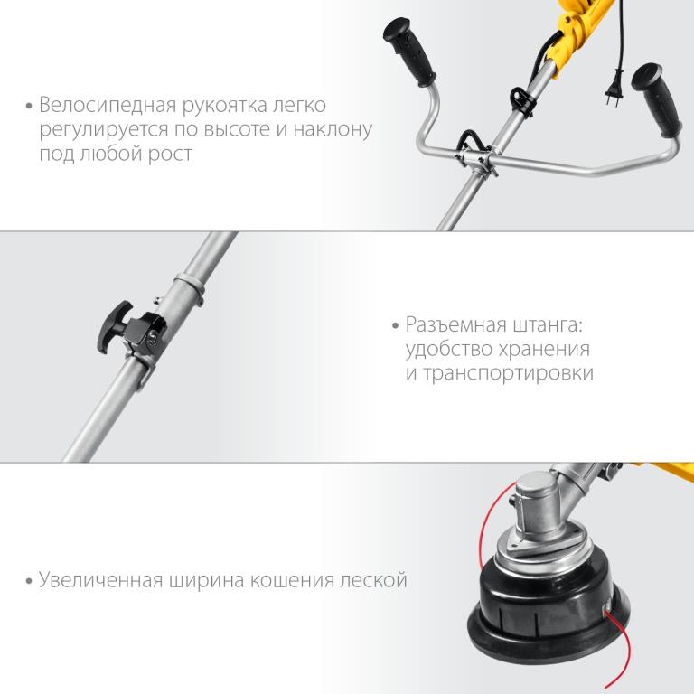 - Возможность установки двух видов режущего инструмента - лески и ножа - делают изделие универсальным