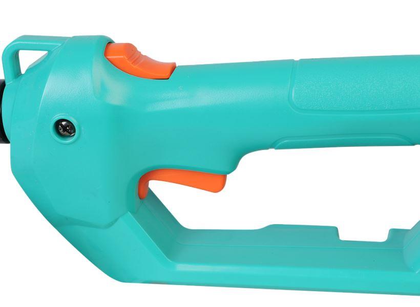 Дополнительное удобство обеспечивает наплечный ремень, который снижает нагрузку на руки. D-образная рукоятка делает электротриммер более компактным, что позволяет легче обходить преграды. После работы не нужно разбирать триммер для хранения.