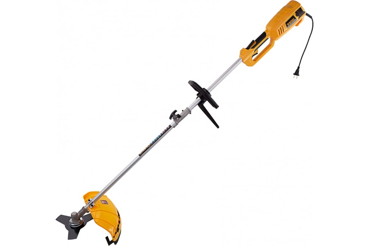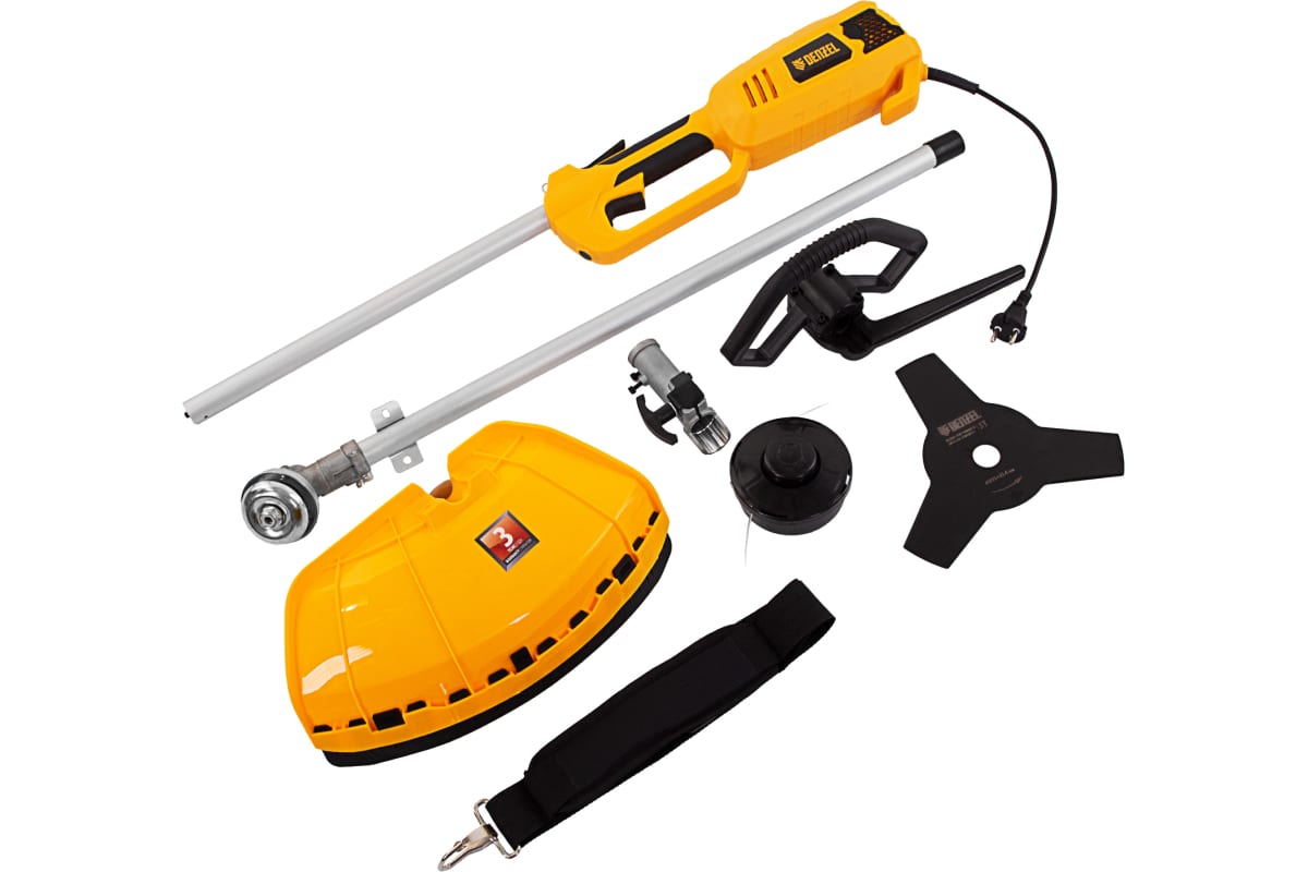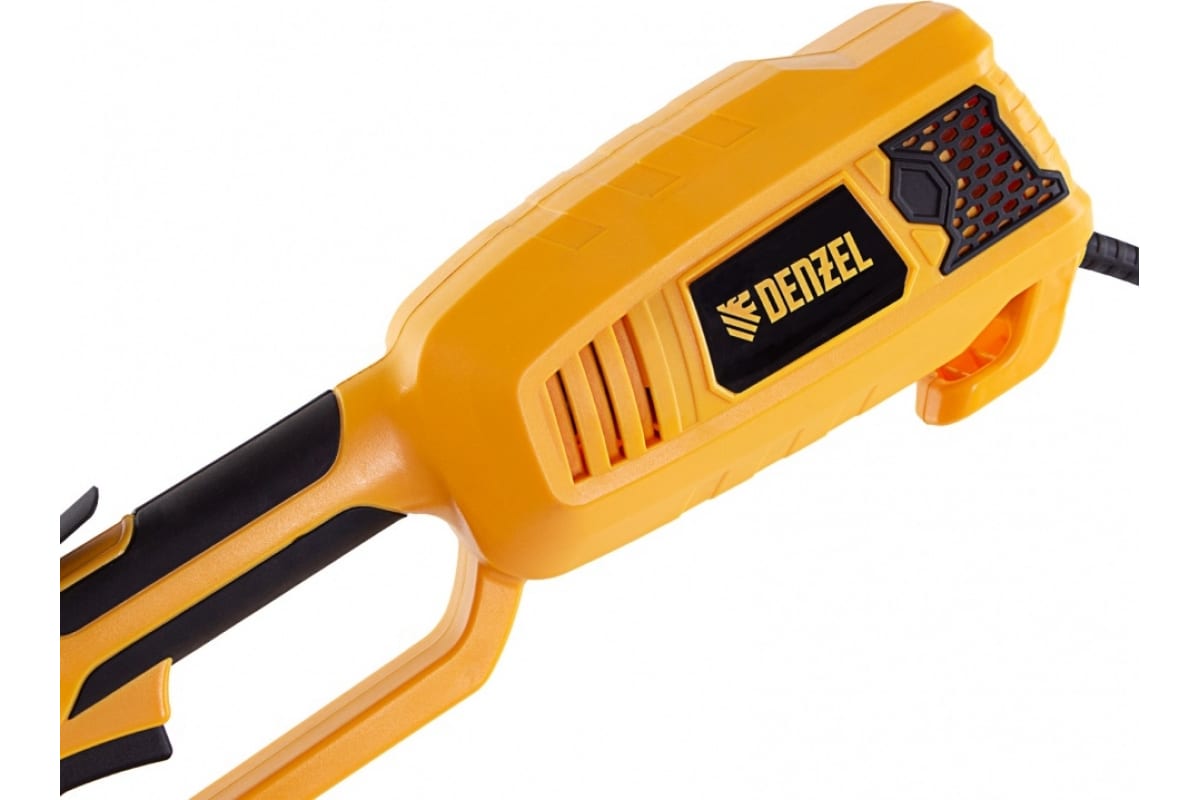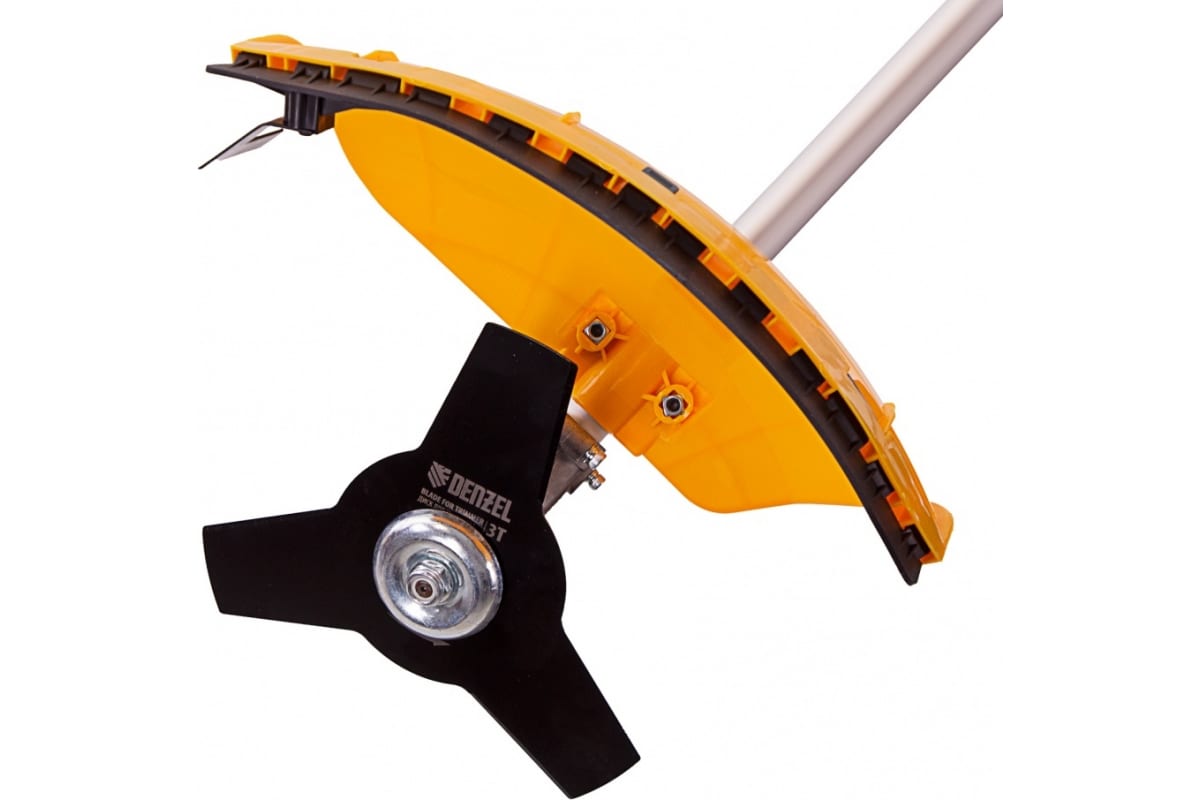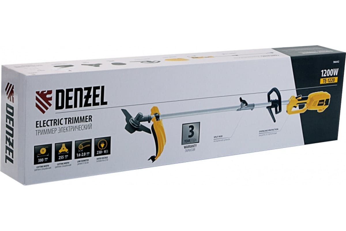 Электрический триммер Denzel TE-1220 96642 с разборной штангой предназначен для скашивания травы на дачном участке. Мощный двигатель на 1200 Вт обеспечивает вращение катушки на триммере и диска со скоростью 7500 об/мин. Ширина скашивания за один проход составляет 38 см при использовании лески и 25,5 при использовании диска, что удобно для работы на небольших участках. Электродвигатель не требует приготовления топливной смеси и сложного технического обслуживания. Благодаря отсутствию вредных выбросов и неприятного запаха работа триммера для газона не вредит здоровью и не вызывает дискомфорт.