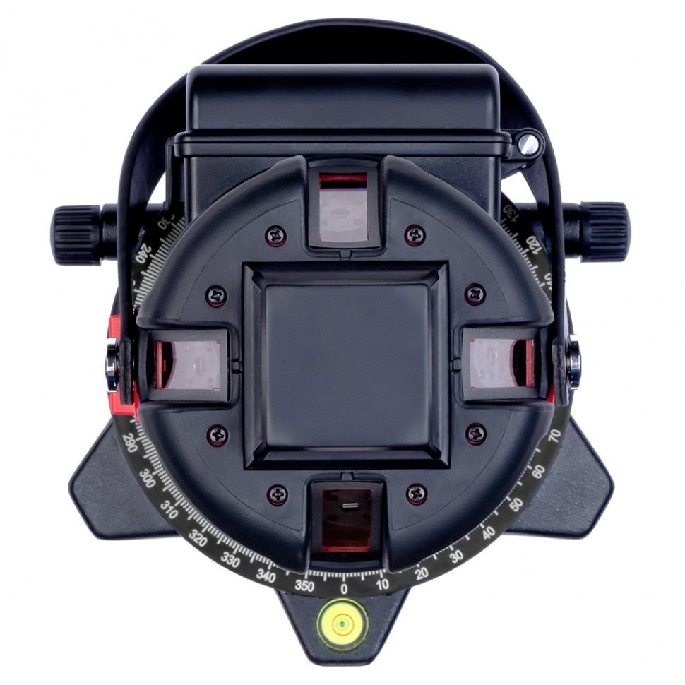 Поворотное основание. В основании корпуса расположена поворотная часть для плавного и точного наведения вертикальных линий. В поворотном механизме используются подшипники плавного скольжения, с высокой осевой точностью. Благодаря этому достигается отличная точность, мягкость и плавность поворота прибора вокруг оси. Ручкой плавной подстройки прибор поворачивается вправо-влево на 360° вокруг своей оси. Наведение на нужную точку точное и простое.