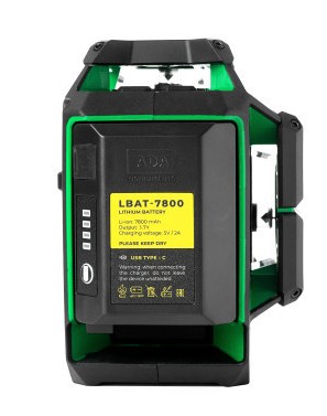 Мощный литиевый аккумулятор. ADA LaserTANK 3-360 GREEN работает от съемного литиевого аккумулятора емкостью 7800 мAч. Большая емкость аккумулятора значительно увеличивает время непрерывной работы по сравнению с обычными лазерными уровнями. Разъем для зарядки аккумулятора - USB Type-C.