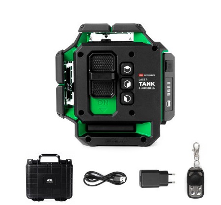 Профессиональный лазерный уровень. ADA LaserTANK 3-360 GREEN Basic Edition –профессиональный лазерный уровень ADA Instruments проецирующий три линии 360°. Взаимно перпендикулярные линии (одна горизонтальная и две вертикальные) позволяют выполнить абсолютно любую разметку. Идеально подходит при проведении строительных или ремонтных работ снаружи и внутри помещений.