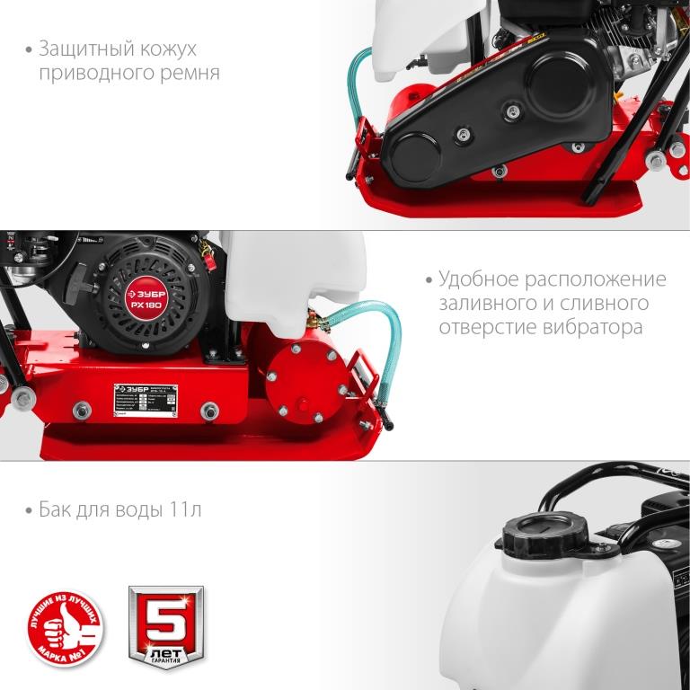Виброплита предназначена для уплотнения бетонных, асфальтовых и сыпучих материалов, а также для формирования уплотненных поверхностей. Компактная конструкция позволяет осуществлять уплотнение смешанного грунта в самых узких местах, даже в очень узких траншеях. Направляющая рукоятка с виброзащитой позволяет увеличить количество часов непрерывной работы и снизить усталость для оператора. Четырехтактный двигатель ″ЗУБР″ обеспечит беспроблемную эксплуатацию при минимальном сервисном обслуживании на весь срок использования.