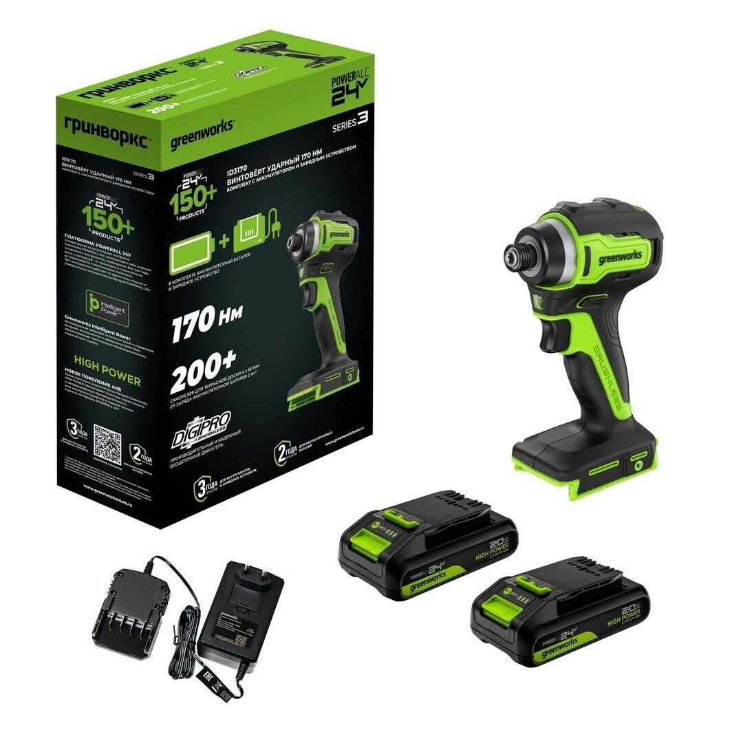 Винтоверт ударный акк. Greenworks ID3170, 24V, б/щет, 0-3200об/мин, 4000 уд/мин, HEX 1/4, 170Нм, 2х2Ач,ЗУ,кор (3804907CUC)