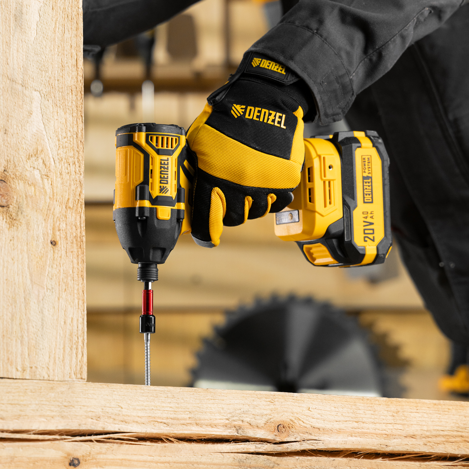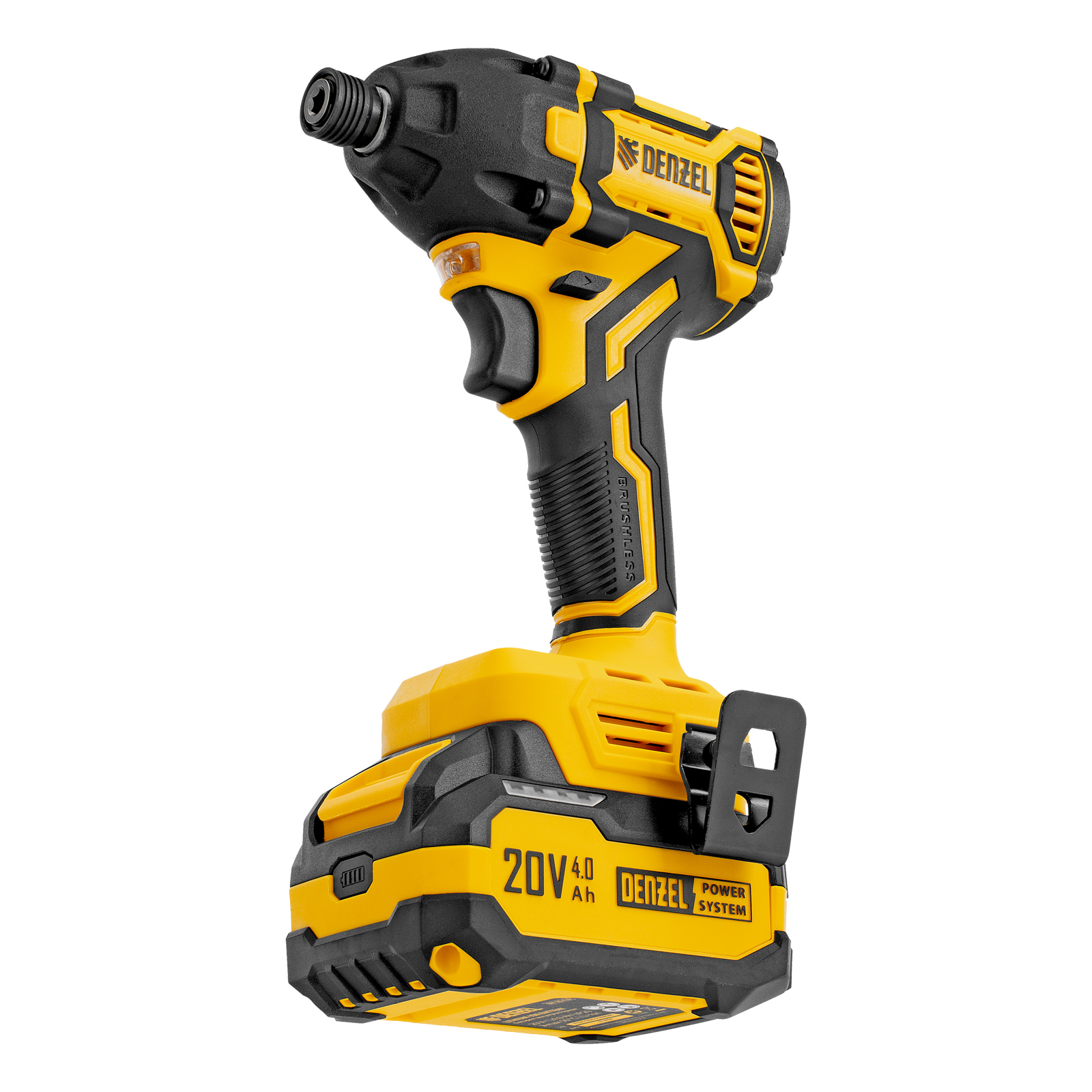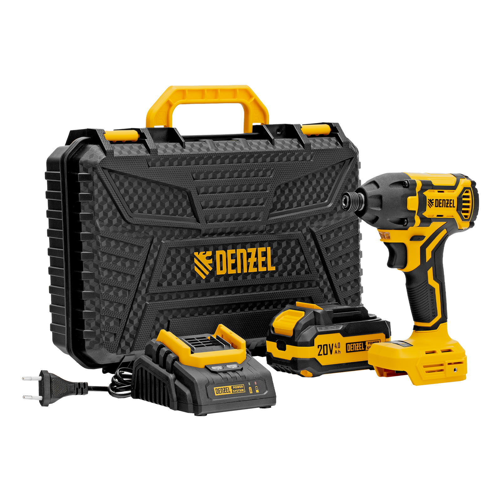 - Универсальность — аккумулятор Li-Ion емкостью 4 А·ч совместим со всеми инструментами единой платформы Denzel Power System 20V.
