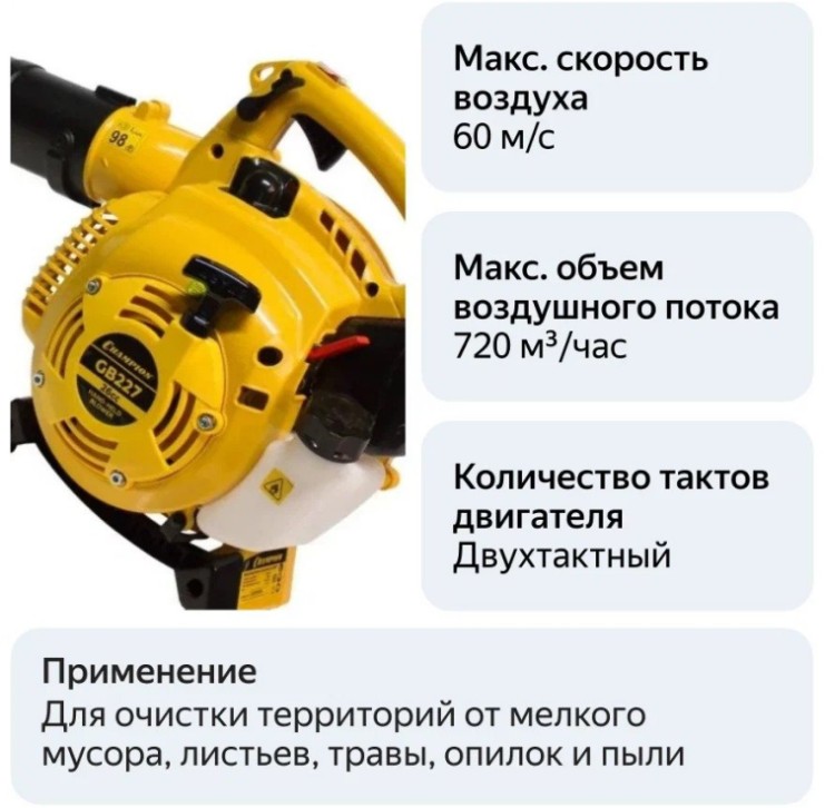 Воздуходув Champion GB 227 - предназначен для очистки территорий от мелкого мусора, листьев, травы, опилок и пыли. Оснащен двухтактным двигателем с воздушным охлаждением, который обеспечивает инструменту высокую скорость и объем воздушного потока. Запускается ручным стартером.